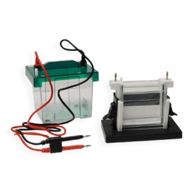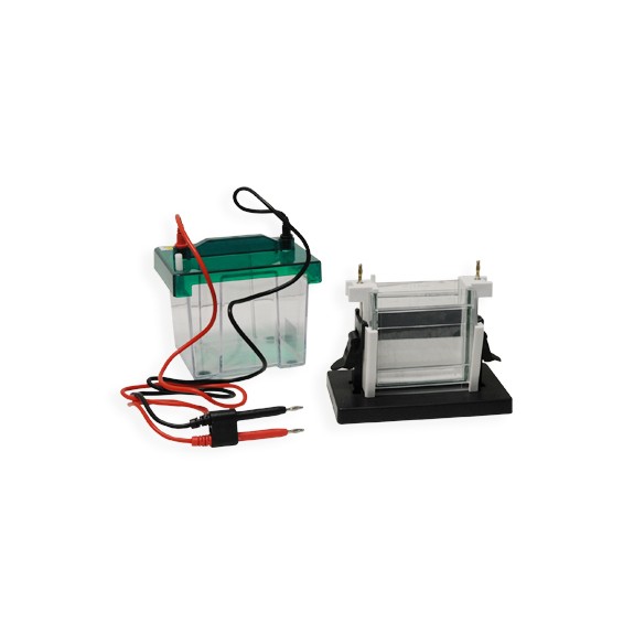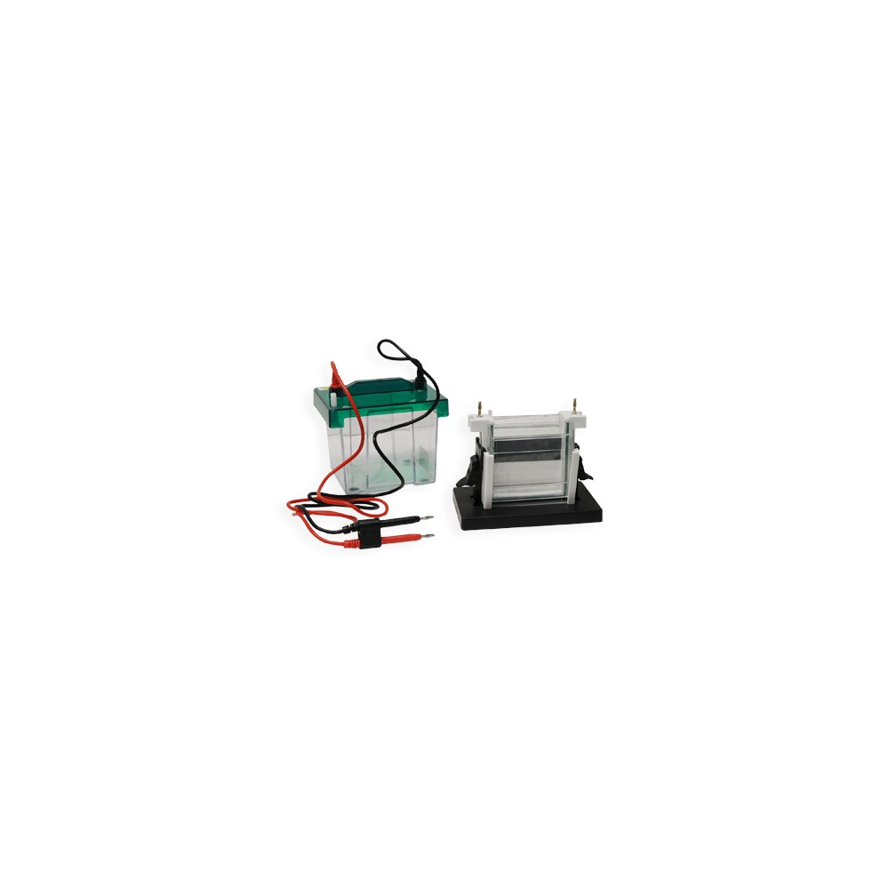 Complète: cuve, couvercle avec electrodes, support de gels, dispositif pour polymérisation de gels, plaques en verre plates et avec encoches et jeu de peignes Pour préparation et électrophorèse de 1 ou 2 gels de 82x82 mm Peignes: 10 et 15 puits de 1 et 1.5 mm épaisseur Dimensions 150x140x100 mm
