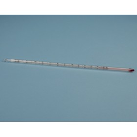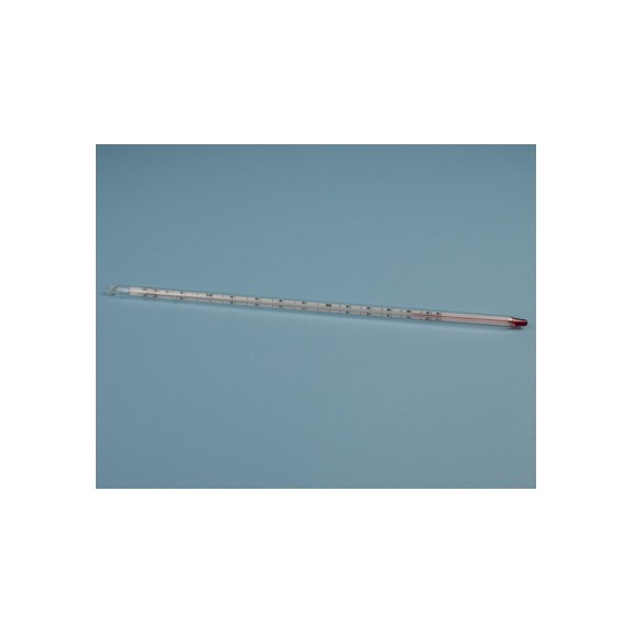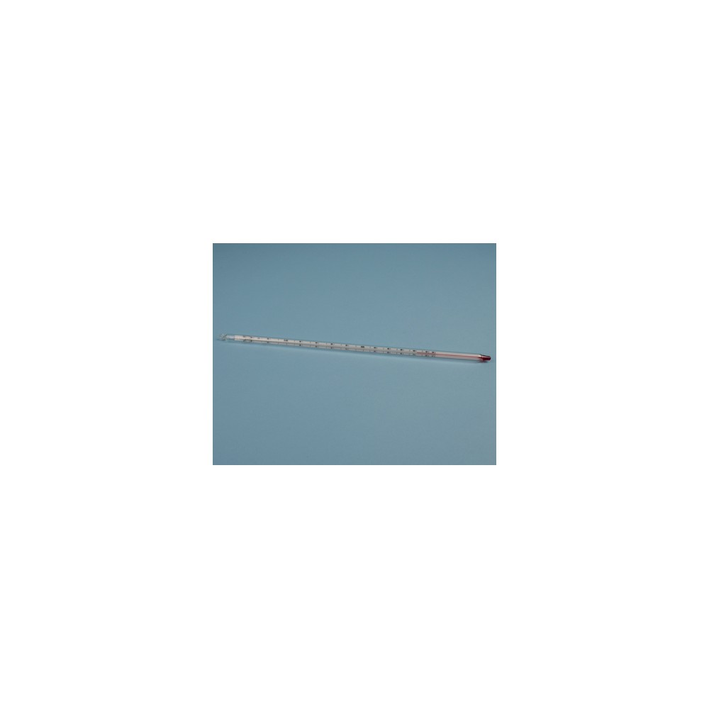 Ce thermomètre est doté d'une échelle intérieure en verre opale et d'un remplissage au liquide organique rouge. Sa échelle est de -10/250 ºC avec des divisions de 2 ºC. Il a un diamètre de 8 mm ± 1 mm et une longueur de 30 cm. Il est également fourni avec un anneau en verre.