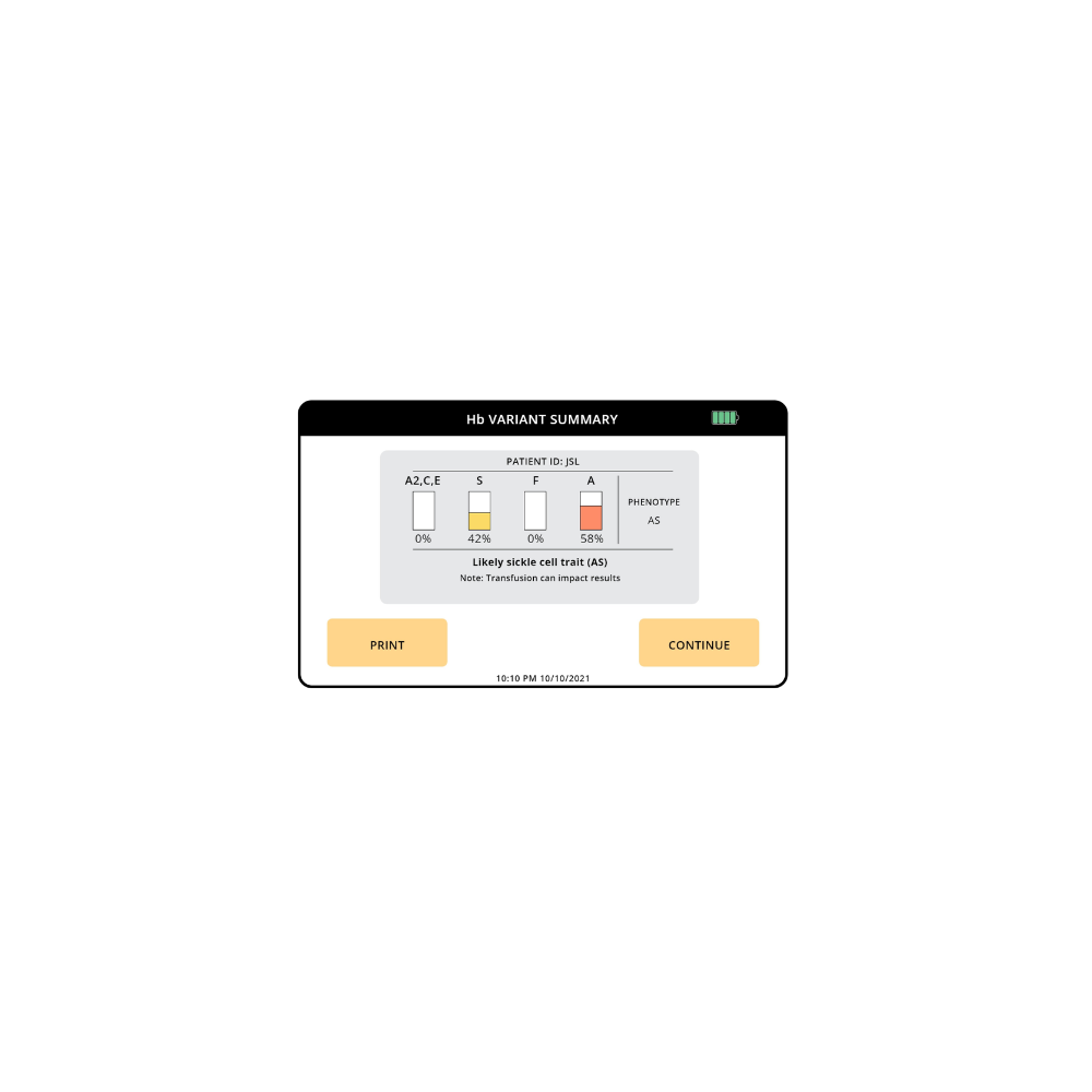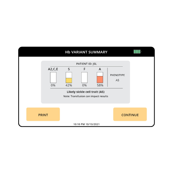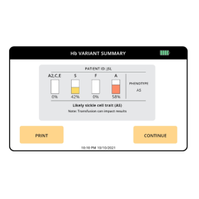 Gazelle Hb Variant est une version miniaturisée du test de référence connu sous le nom d'électrophorèse sur acétate de cellulose. L'administration du test nécessite une formation minimale. Les résultats sont affichés en 8 minutes, y compris les pourcentages d'hémoglobine par type, et peuvent être stockés dans l'appareil ou imprimés.