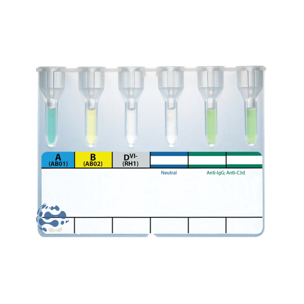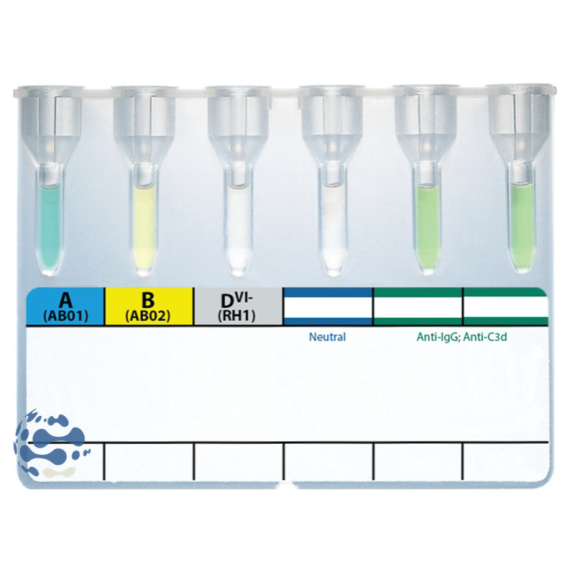 Carte gel de profil A-B-D-AHG-AHG-AHG destinée à la réalisation de l’épreuve globulaire ABO, à la détermination de l’antigène RH1(D) et au test de compatibilité.