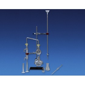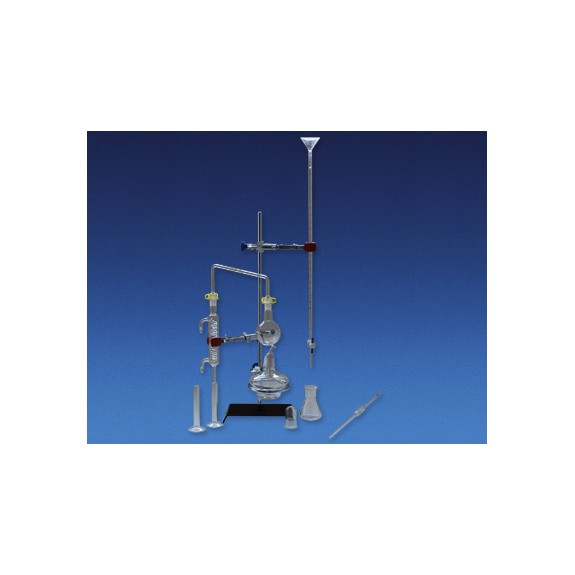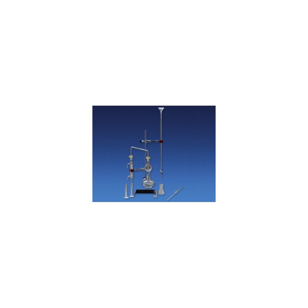 Cet appareil Clevenger est idéal pour la détermination des huiles essentielles et est léger. Il est composé d'un Falcon Erlenmeyer de 50 mL, d'une burette graduée de 10 mL, d'un refrigérant Liebig de 120 mm, d'un condensateur à bobine de 120 mm, d'une pipette 1 trait de 11 mL, d'une éprouvette jaugée de 5.1 mL, d'une éproue d'alcool, d'un entonnoir à branche courte de 40 mm, d'un ballon f/rond de 50 mL, d'une pièce double coudée rodage 14/23, de 2 pinces noix giratoire, d'un support pied plat de 100x175 mm, de 2 clips et d'un anneau avec pied plat.